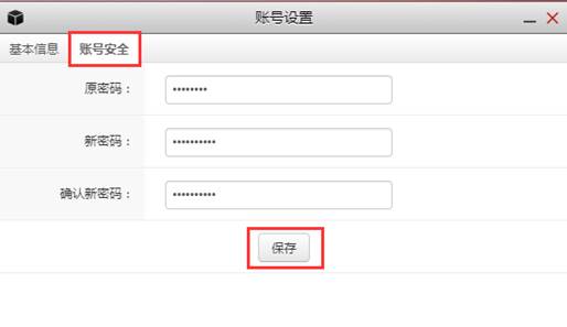 在账号设置弹窗中点击“账号安全”,输入原密码、新密码、确认新密码后点击“保存”完成密码修改。