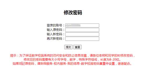 2021年10月19日开始,如果前期没有整改的,登录数字校园后,直接进入到数字校园的密码修改页面,按照页面的提示输入原来的密码,输入2次新密码,然后提交,完成修改后才能继续使用。