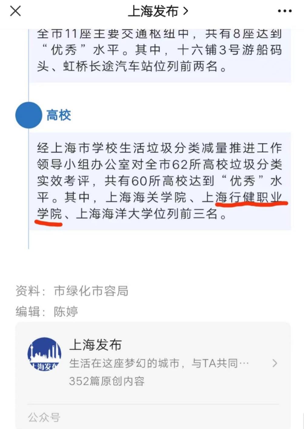 近日,上海市2022年下半年度垃圾分类实效情况综合考评结果公布,经上海市学校生活垃圾分类减量推进工作领导小组办公室对全市62所高校垃圾分类实效考评,我院达到“优秀”水平,获得了全市高校第二名的好成绩,“上海发布”对考评结果进行了报道。