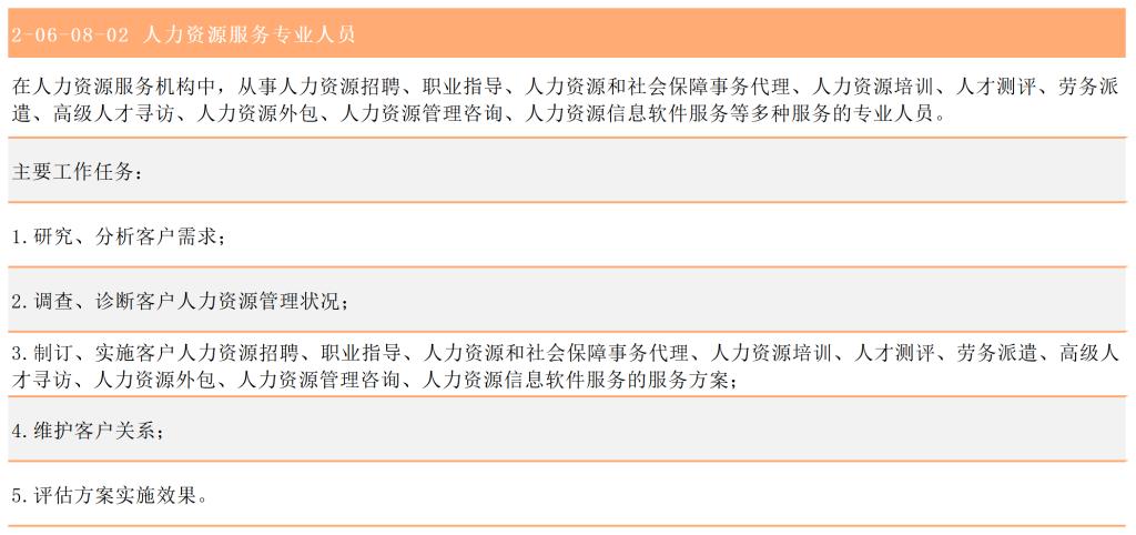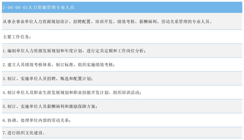 《中华人民共和国职业分类大典(2022年版)》将在单位内或人力资源服务机构中,从事人力资源规划设计、招聘配置、培训开发、绩效考核、薪酬福利、劳动关系等工作或咨询服务的专业人员,统一归为“人力资源专业人员”小类,小类编码是2-06-08(GBM 20608)。