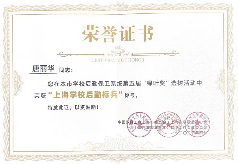 2023年3月28日,上海学校后勤保卫系统第五届“绿叶奖”风采展示活动在复旦大学相辉堂举行。我院后勤保卫处唐丽华同志荣获“上海学校后勤标兵”称号。