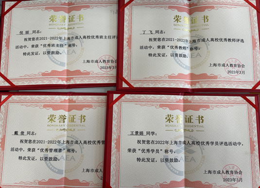 近日,由上海市成人教育协会院校教育专业委员会主办的“2022年上海市成人高校优秀教师、优秀管理工作者和优秀班主任”、“2022年上海市成人高校优秀学员”评选结果已揭晓。由学校继续教育部推荐的丁飞老师被授予“2022年度上海市成人高校优秀教师”称号、戴俊老师被授予“2022年度上海市成人高校优秀管理工作者”称号、倪丽老师被授予“2022年度上海市成人高校优秀班主任”称号、王景娟同学被授予“2022年度上海市成人高校优秀学员”称号。