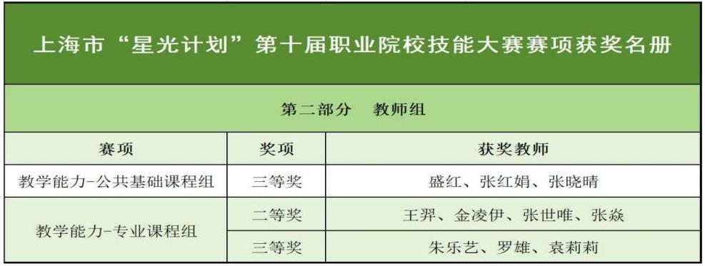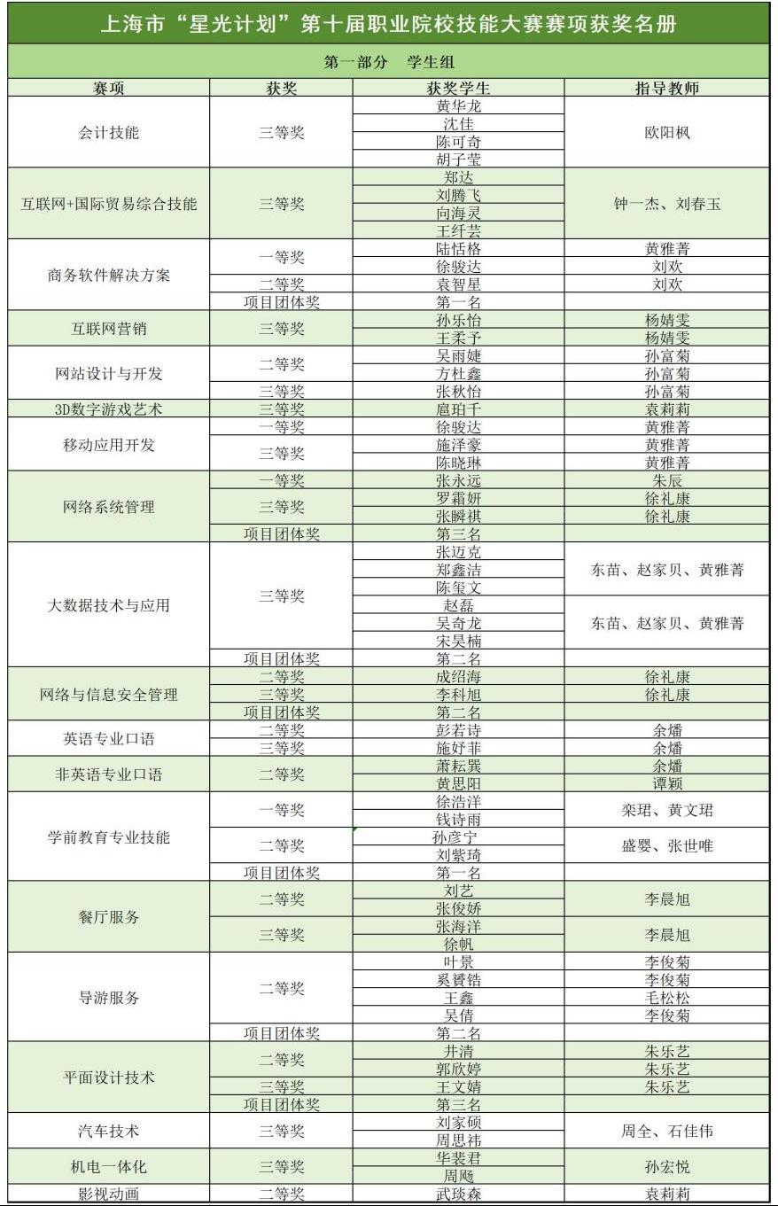 星光不负赶路人,时光不负追梦人。近日,“星光计划”第十届职业院校技能大赛获奖名单出炉,我校师生精钻专业、不断创新、硕果累累。在上海市“星光计划”第十届职业院校技能大赛中,我校共参加20项学生赛、5项教师组教学能力赛项的角逐。学生赛项收获一等奖4个,二等奖11个,三等奖16个;教师组教学能力赛项荣获二等奖1个、三等奖2个。学校荣获优秀组织奖。我校黄雅菁老师被授予“三星级金牌指导教师”荣誉称号。