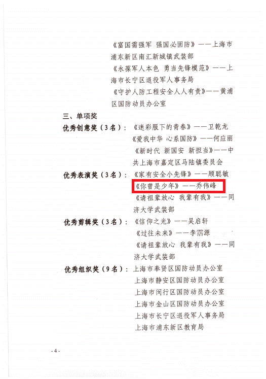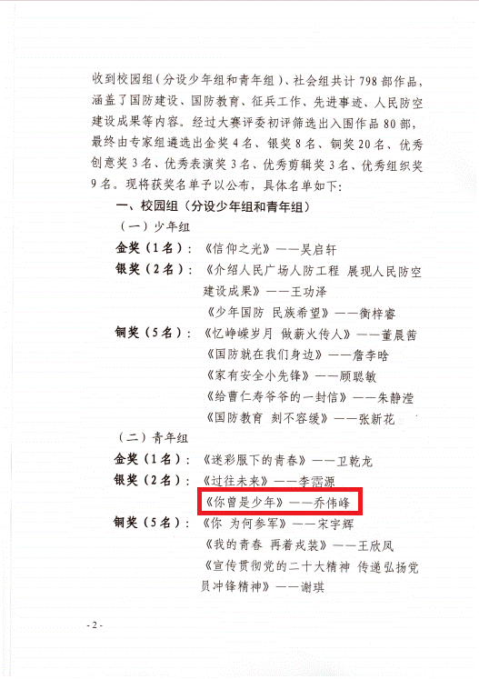 据了解,此次微视频大赛共收到校园组(分设少年组和青年组)、社会组共计798部作品,涵盖了国防建设、国防教育、征兵工作、先进事迹、人民防空建设成果等内容。经遴选,入围作品80部、金奖4名、银奖8名、铜奖20名、优秀创意奖3名、优秀表演奖3名、优秀剪辑奖3名、优秀组织奖9名。乔伟峰同学发挥自身专业特长,结合应征入伍切身经历创作的参赛视频,受到评委老师的一直好评。