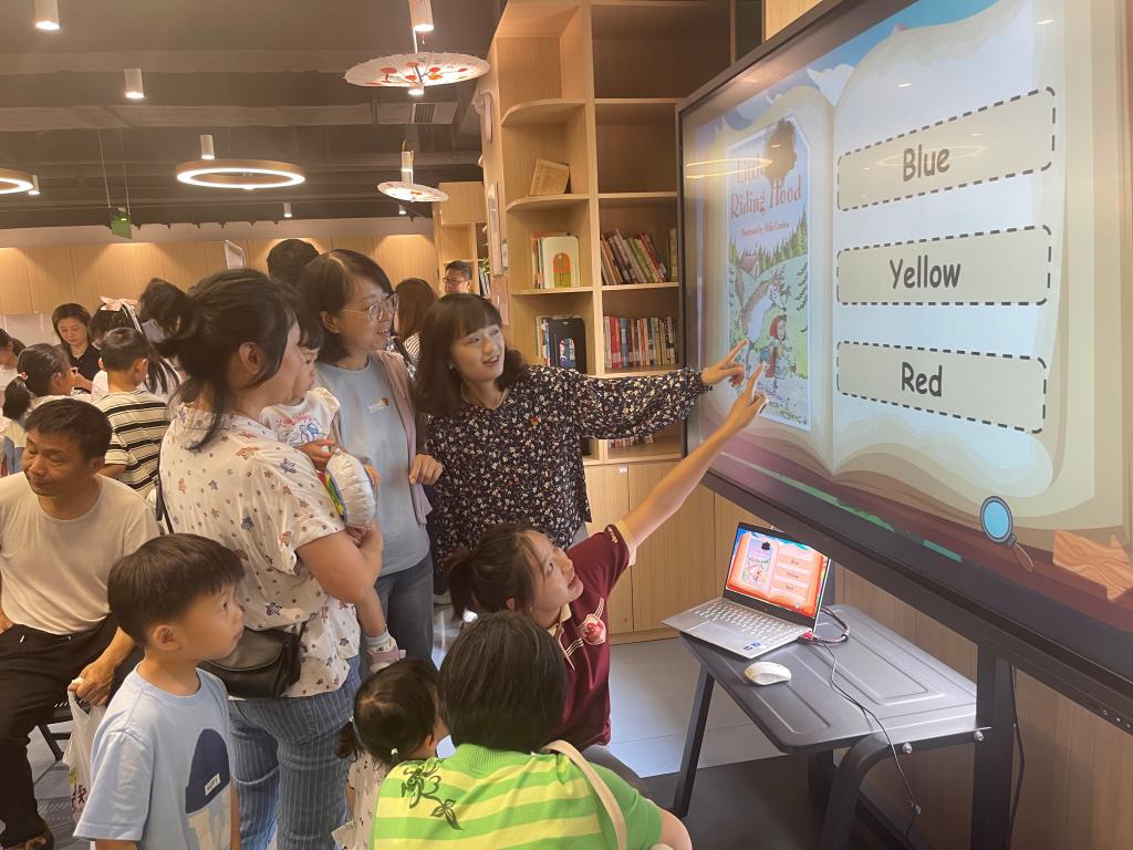 6月1日当天,教师们早早来到小镇驿站,为当天的活动做好准备。孩子们在爸爸妈妈的陪伴下,纷至沓来。在“小小外交馆”和“鹦鹉学舌”的活动区域,教师们通过绘本阅读和互动游戏,带领孩子们一起开启了一场英语童话之旅。小朋友们被《三只小猪》、《小红帽》、《丑小鸭》、《美女与野兽》的故事深深吸引。在互动游戏环节,小朋友们争相举手、跃跃欲试,在轻松愉快的氛围中掌握了相关绘本的英文单词。