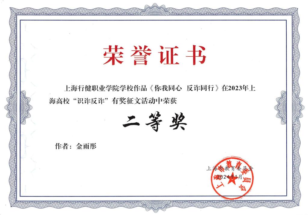 2024年1月,我校沈梦圆同学在上海市教育委员会组织的“识诈反诈”校园宣传达人选拔大赛中荣获二等奖,金雨彤同学在“识诈反诈”有奖征文活动中荣获二等奖。