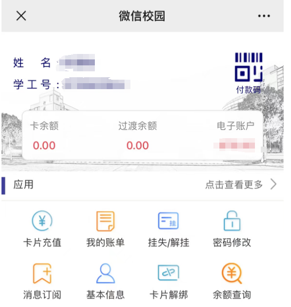 一卡通应用有二维码支付、卡片充值、我的账单、挂失/解挂、密码修改、卡片解绑等相关应用,师生可通过相应应用进行卡的充值、挂失/解挂、消费明细查询等相关操作。