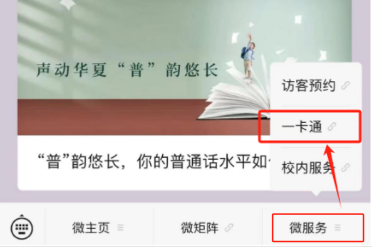 2、 在公众号微服务菜单中,点击“一卡通”;