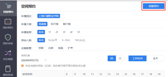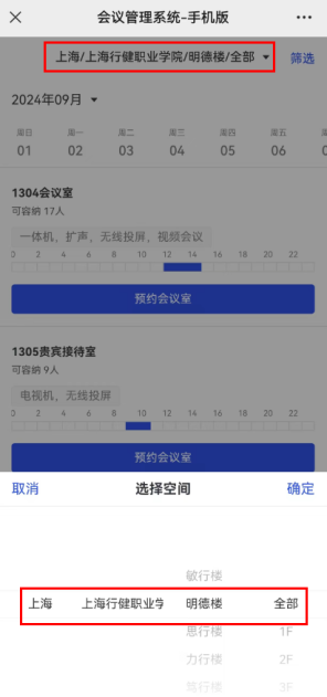 进入预约页面可以查看当前楼宇所有会议室的预约情况。
