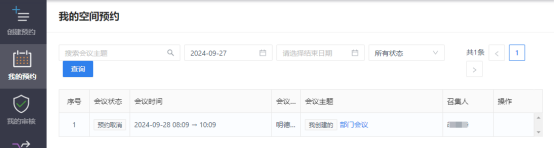 在我的预约中可查看已预约的会议室。如需取消点击操作下方图标可以取消预约。