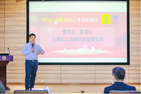 仪式上,上海泓江信息科技有限公司董事长楚万文介绍了RPA行业发展及RPA+AI数字化人才培养路径。据他介绍,来也科技公司是中国乃至全球的RPA+AI行业领导者,是我国目前该领域融资金额最多的企业。泓江科技公司则具有十余年的产教融合成功经验,与来也科技共同打造了一整套基于RPA的学习实践课程体系和引企入校、深度融合的人才培养模式,构架了产学研一体化的产教融合基地新模式。他表示,两家企业未来将立足企业数字化转型与RPA产业发展的需要,与开云网页版页面共同聚焦RPA机器人产业在电商领域的应用和推广,率先培养电商行业RPA机器人应用实施人才,打造RPA产业人才赋能平台,不断优化产业人才标准,实现基于人才测评与职业能力认证的精准就业推荐。