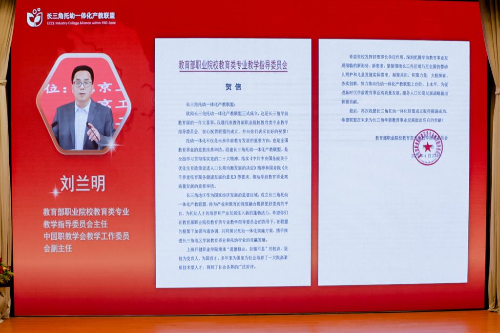 刘兰明代表教育部职业院校教育类专业教指委祝贺联盟的成立。他希望长三角托幼一体化产教联盟成员携手推进长三角地区学前教育事业和托幼产业的双赢发展,凝聚共识、积聚力量,大胆探索、务实创新,努力推动托幼一体化产教联盟上台阶、上水平,为促进新时代学前教育事业高质量发展,服务人口长期发展战略做出积极贡献。