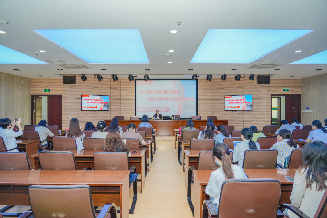 为进一步强化作风建设,不断推动深入贯彻中央八项规定精神学习教育取得实效,5月13日,学校党委书记沈燕华以《深入贯彻中央八项规定精神 以优良作风推动学校高质量发展》为题讲授专题党课,相关职能部门负责人和各基层党支部委员聆听党课。