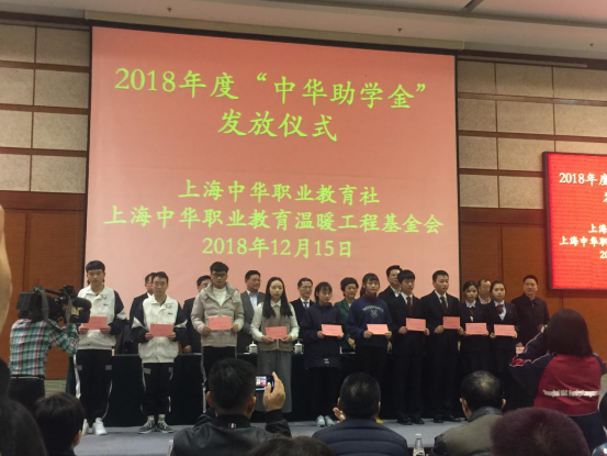 12月15日上午,由上海中华职业教育社、上海中华职业教育温暖工程基金会共同举办的2018年度“中华助学金”发放仪式,在上海科学会堂举行。我院应用艺术系赵云佳、王海浪、信息技术与机电工程系王昱淇、张鸿翼,获得此次助学金。应用艺术系18级辅导员陈盐青老师带领赵云佳、王海浪两位同学参加此次发放仪式。