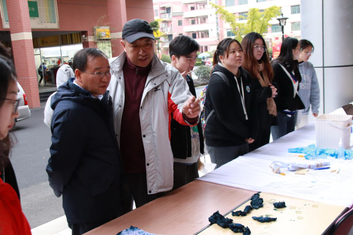 活动现场,艺术系团学联的同学们在白坯布包上进行设计,从调配染料到各种手工染制、漂洗晾晒,一块普通的白布,经过浸湿、勒扎、涂染、打开晾干,布巾、布包、T恤等一件件扎染设计作品展现在众人眼前。其图案千姿百态、若隐若现、韵味别致。吸引大批同学驻足观看,同时现场提供方巾让同学们体验,在专业老师的指导下,同学们纷纷针对自己的作品进行不同折法和叠法的尝试,制作的扎结及配色的方法各不相同,从选取色彩到创意生成,再到作品完成,都体现了同学们的巧思,天马行空的想象力。思维的碰撞交流,摩擦出不一样的火花。一块块方巾在同学们的精心打造后,焕然一新,形成了各种各样、丰富多彩的图案。
