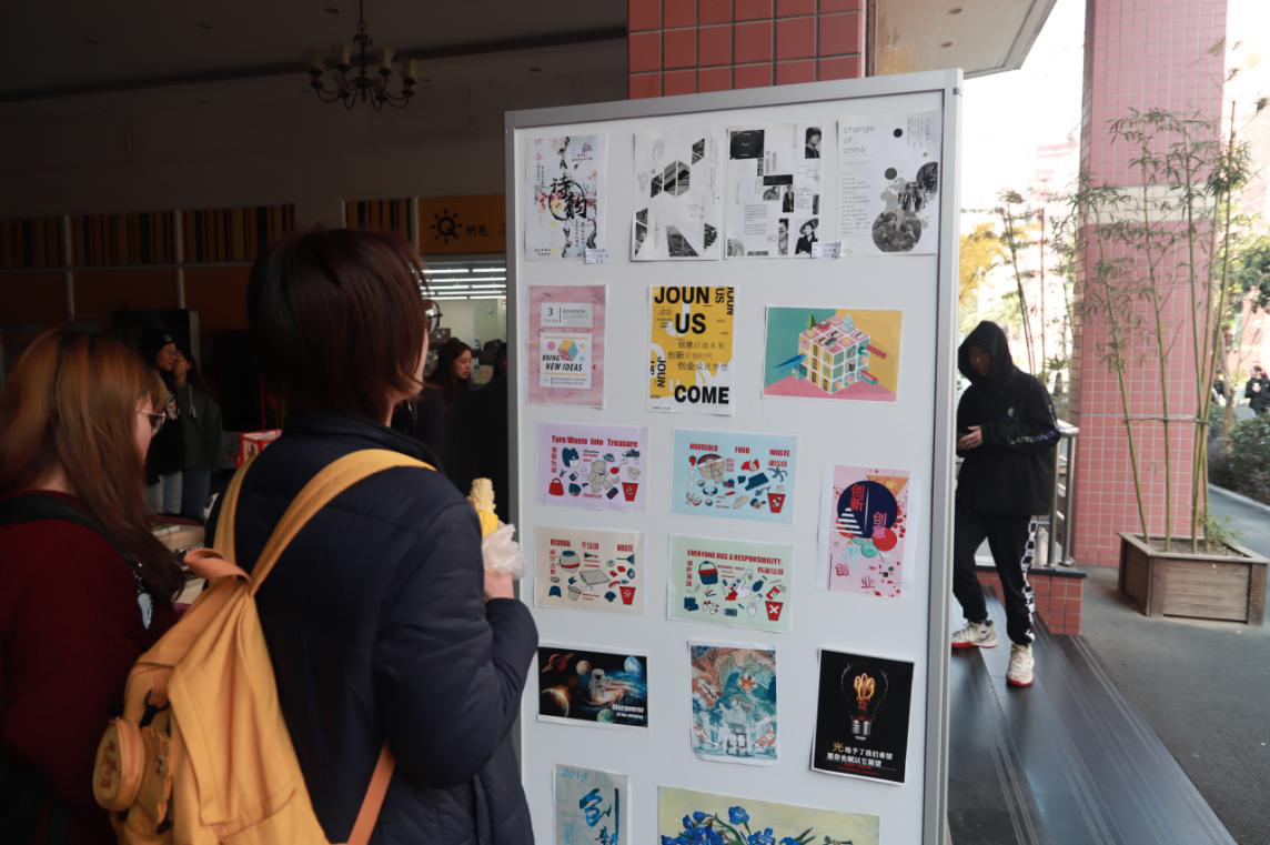 12月10日中午,优秀作品成果的展示吸引来往的同学驻足观赏,尤其是创意摄影类作品,新奇的摄影构图以及创意错位拍摄,受到在场很多同学的喜爱。废物利用展品充分利用生活中废弃物的原材料,通过同学们充满创意和艺术气息的改造,对废弃物品重新利用,让人大开眼界的同时也宣传了环保理念。