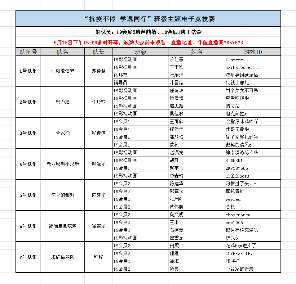 总共有27名同学和辅导员叶晋熔报名参赛,组成7支参赛队伍。担任解说任务的19会展2班的芦喆婧和19会展1班的王浩森同学在赛前做了充分准备,在斗鱼直播间以近乎职业的水准为没有参赛的同学呈现了整场比赛的精彩解说。