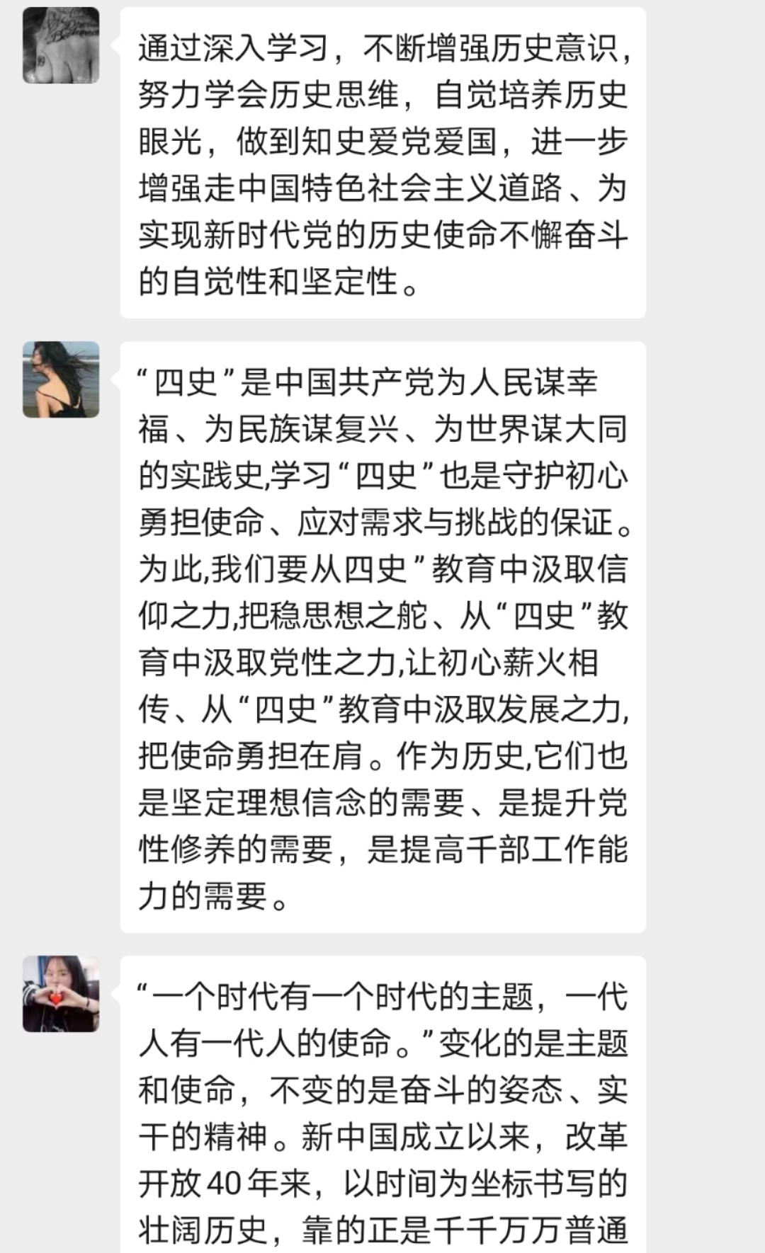 与会同学们认真参与、积极学习,纷纷表示通过学习充分认识“四史”学习教育的重要意义,结合当前疫情的实际情况,表示从此次疫情抗击战,深刻体会到,国是大家,小家汇成大家的真正含义,认识到“四史”学习教育的重要意义,要不断增强历史意识,做到知史爱党爱国,为实现中华民族伟大梦想,不断奋斗。