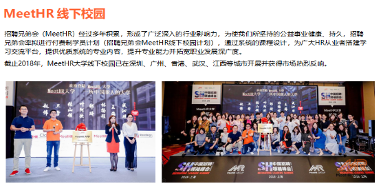MeetHR创始于2012年发起的HR社群组织-招聘兄弟会,由中国顶尖外企和名企的招聘总监们组成。目前在全球36个地区有分会组织,有近100万HR的粉丝。作为“HR组织”发起人、领航者,致力于打造HR的共享社区。其使命是共筑中国HR人的伟大,长久在广大HR心目中树立了极高的口碑和品牌形象。