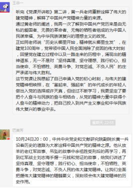 按照党委的通知,10月24日,支部组织党员收看央视一套开讲啦第二期,听取了中共中央党史和文献研究员黄一兵副院长介绍了建党100年来的精神支柱的形成历程:我们的精神支柱来自中国共产党人坚持真理、坚守理想;践行初心、担当使命;不怕牺牲、英勇斗争;对党忠诚、不负人民。在建党以来的各个时期,正是因为坚定不移的坚持党的理想信念,克服了各种困难,我们的国家才一步一步走向辉煌。我们要始终坚持把人民放在心中,坚持“江山就是人民,人民就是江山”而奋斗不息。