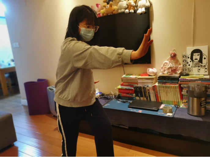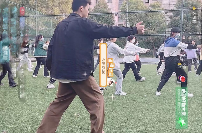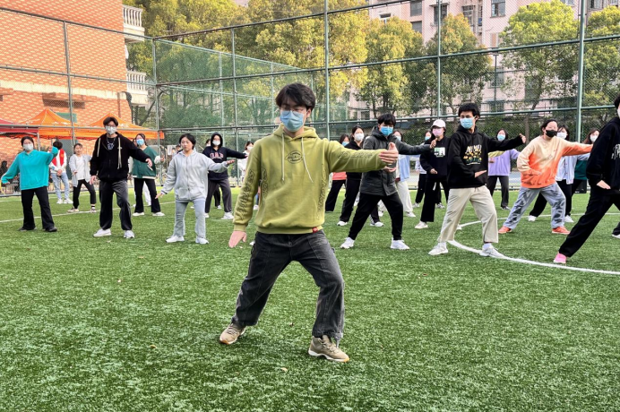 活动当天,来自全系共计42名同学在西区草坪上集合,大家自觉遵守防疫要求,佩戴口罩、间隔一米以上。由学系文体部同学化身“小老师”进行动作教学,伴随着音乐,同学们的一招一式尽显太极拳的柔美,他们动作柔和缓慢,其一举一动,一意一念充分展现了太极拳的动静结合,刚柔快慢的态势,吸引了草坪旁大批同学的目光。而同步的线上直播更是受到了校外居家隔离同学们的欢迎,通过网络弹幕的积极互动,有同学表示,和大家一起云学习的形式很新颖,反复回看教学视频,不仅可以巩固自己体育课的学习,还可以强身健体抗击疫情。