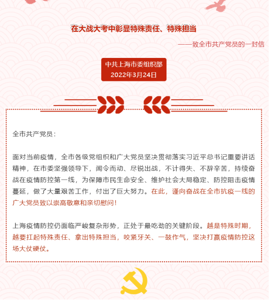 在这封信里,市委组织部从“党员要带头担起政治责任、党员要带头发挥党员作用、党员要带头联系服务群众、党员要带头做好宣传引导”四个方面对疫情防控形势下党员应起的旗帜作用和堡垒作用提出了要求。支部结合实际,要求各位党员在疫情防控中发挥先锋模范作用,带头强化政治担当,坚决贯彻落实党中央决策部署。教师要开展好线上教学,行政人员和辅导员按照开云online(中国)安排完成值班工作,积极参加志愿服务等。
