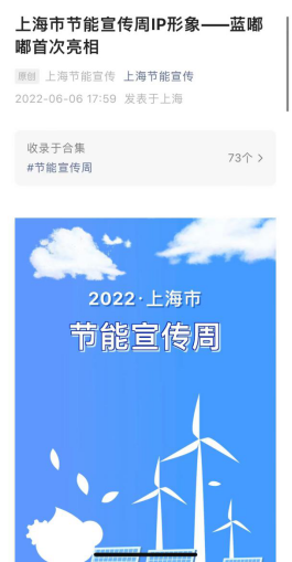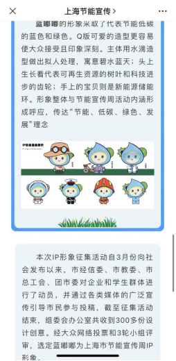 本次IP形象征集经市经信委、市教委、市总工会、团市委对企业和学生群体进行了动员。经大众网络投票和3轮小组评审,选定19级广告设计与制作专业(新媒体艺术方向)赵陈顿同学设计的“蓝嘟嘟”为上海市节能宣传周IP形象。