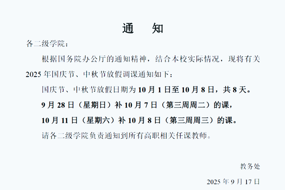 2025年国庆节、中秋节放假调课通知