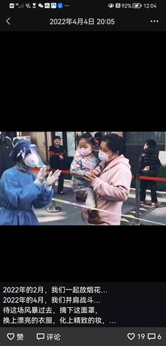 从3月31日至今,每天仍在面对随叫随到工作任务,不管前一刻在做什么,都必须在第一时间到岗。面对人口众多的家庭,把余多的物资分给他们;面对渴望水果的孕妇,把自己的物资送给她;面对不会自检的老年人,一步步耐心演示;面对排队核酸要发情绪小宝宝,陪她玩“木头人”;为了及时安排核酸排队,做到不聚集、且有序,在寒冷的早晨,一站就是六个小时。