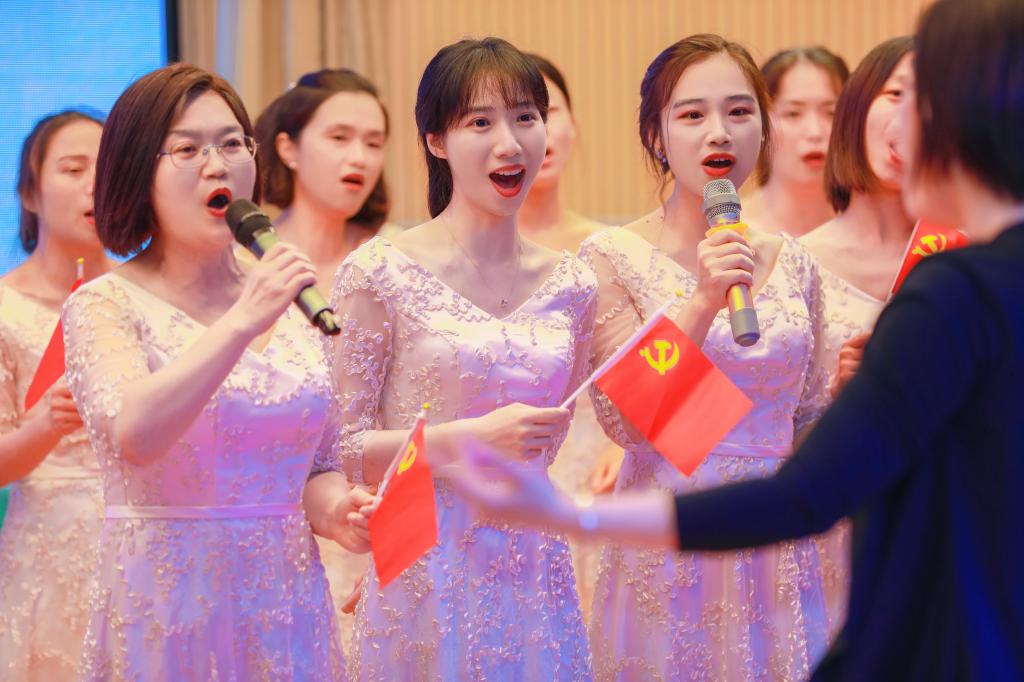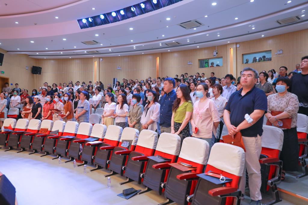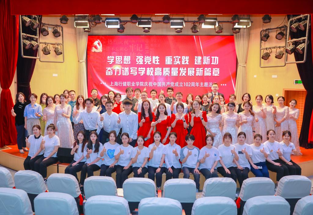 活动最后,当《没有共产党就没有新中国》音乐响起时,学校领导班子成员、统战部部长、各民主党派主委登上舞台,与现场全体教职工合唱,为中国共产党成立102周年送上行健人真挚的祝福。
