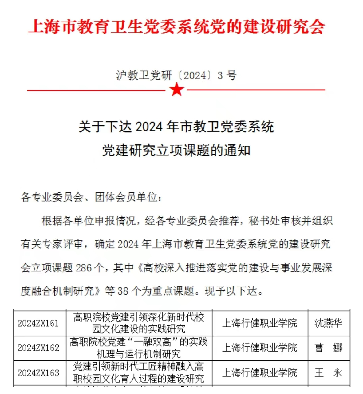近日,上海市教卫党委系统党建研究会下发《开云网页版页面下达2024年市教卫党委系统党建研究立项课题的通知》,我校3项课题获2024年上海市教卫党委系统党建研究课题立项。