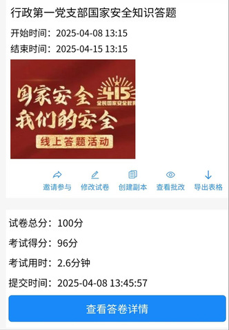 此次活动采用“学、测、践”形式进行,支部通过制作发放专题学习资料,组织支部教职工系统学习《中华人民共和国国家安全法》。围绕国家安全知识,支部开展线上国家安全知识答题活动,全体教职工积极参与,累计参与答题27人,优秀率达到100%。结合主题学习,支部全体教职工也积极行动起来,排查工作中可能存在的风险点,积极进行整改。目前,支部形成了“人人重参与、人人学安全、人人守安全”的浓厚氛围。