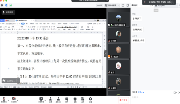 接着,各位专业组组长介绍了各组线上教学的情况。各位专业组长总结到,为如实掌握线上教学情况,确保课程质量,专业组组长对全天授课情况进行了全方面跟踪,对授课平台使用、教师教学过程、学生出勤率等进行了详细记录,在此过程中所产生的问题也积极同师生进行了深入沟通与合理解决。随后,各专业组组长对即将开展的精品在线开放课程作出部署与安排。接着,在舒仙桃老师组织下,全系老师热切交流线上教学经验与疫情期间的生活轶事。最后,在张怡老师的冥想训练与音乐舒缓中结束了本次会议,缓解了大家在疫情期间紧张的情绪。