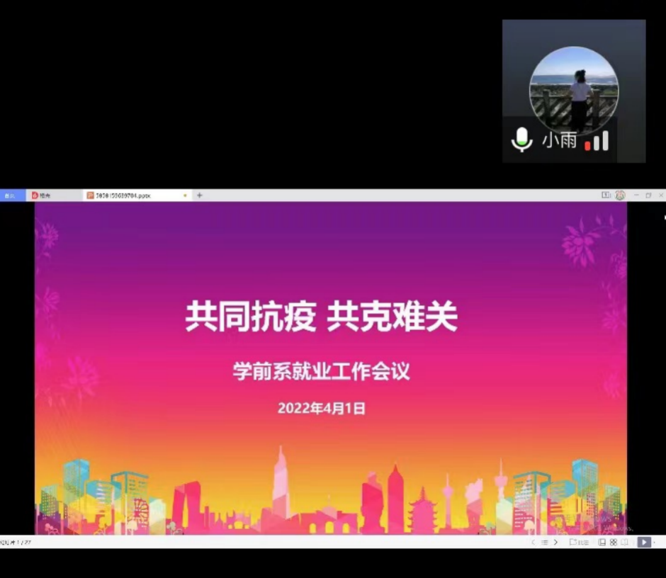 为做好学前教育系2022届毕业生就业工作,进一步结合当下疫情就业形势,解放思想、创新方法、精准发力,促进毕业生更高质量就业,4月1日下午,我系通过腾讯会议的方式线上召开了2022届毕业生就业工作推进会,学前教育系主任李娜,全体毕业班辅导员蒋茜雯、施泠含、王亮、孙宇凝、陆晰莹、谢冬梅、申海燕、潘太健及学生事务秘书卜艳婕参会。