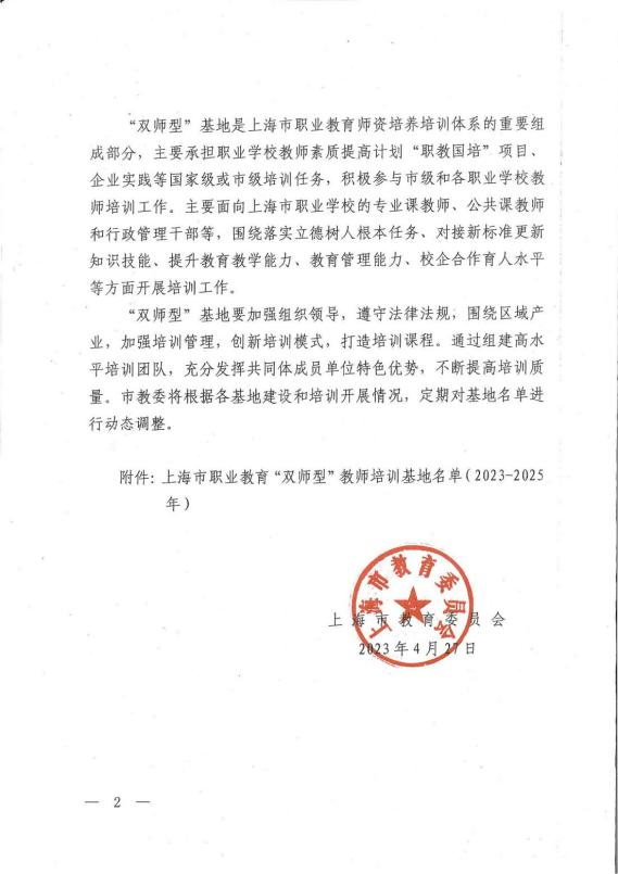 “双师型”基地是上海市职业教育师资培养培训体系的重要组成部分,主要承担职业学校教师素质提高计划“职教国培”项目、企业实践等国家级或市级培训任务,积极参与市级和各职业学校教师培训工作,围绕落实立德树人根本任务、对接新标准更新知识技能、提升教育教学能力、教育管理能力、校企合作育人水平等方面开展培训工作。