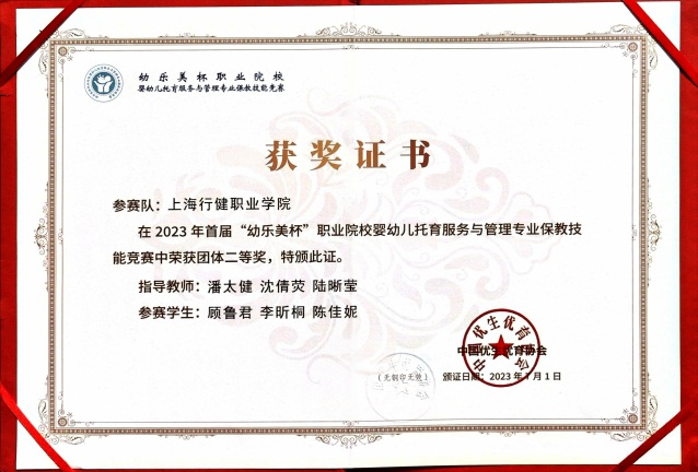 6月30日,本校学前教育系婴幼儿托育服务与管理专业的三名学生陈佳妮、李昕桐、顾鲁君,在指导教师潘太健、陆晰莹和沈倩荧老师的悉心指导下,荣获2023年首届“幼乐美杯”职业院校婴幼儿托育服务与管理专业保教技能竞赛团体二等奖。