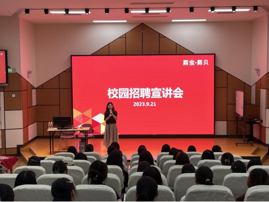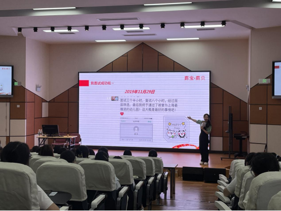 随后我校毕业生2017级胡丽慧学姐以她自己的角度为学弟学妹们带来宣讲,向大家介绍并分享了嘉宝嘉贝幼儿园的一些情况。