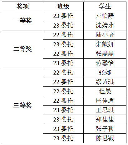 本次学生选拔赛共有22级、23级14位学生参加。参赛学生围绕“婴幼儿回应性照料”和“游戏活动实施”模块进行技能展示,在技能展示过程中参赛学生充分体现了对婴幼儿个体特点和差异的尊重,遵循婴幼儿生长发育规律和特点,落实“热爱婴幼儿、关爱婴幼儿、理解婴幼儿”,彰显了婴托专业学生的专业性和积极性。各位评审老师对学生表现逐个进行了评价,鼓励学生勇敢表现,在未来的学习中进一步融合理论与技能,提高自身的专业水平。最终经过专业评审,决出一等奖2名、二等奖4名、三等奖8名,获奖情况如下: