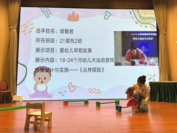 “婴幼儿健康养育照护”赛项参赛选手21婴托2班顾鲁君和备赛选手23婴托沈婧茹对部分竞赛内容进行了技能展示,包含婴幼儿回应性生活照护项目、婴幼儿意外伤害的应急处置项目和婴幼儿早期发展项目,体现了婴幼儿托育服务与管理专业学生对婴幼儿回应性照护、游戏活动实施、伤害预防与处理等专业技能水平以及关注婴幼儿、态度亲和的职业道德素养。