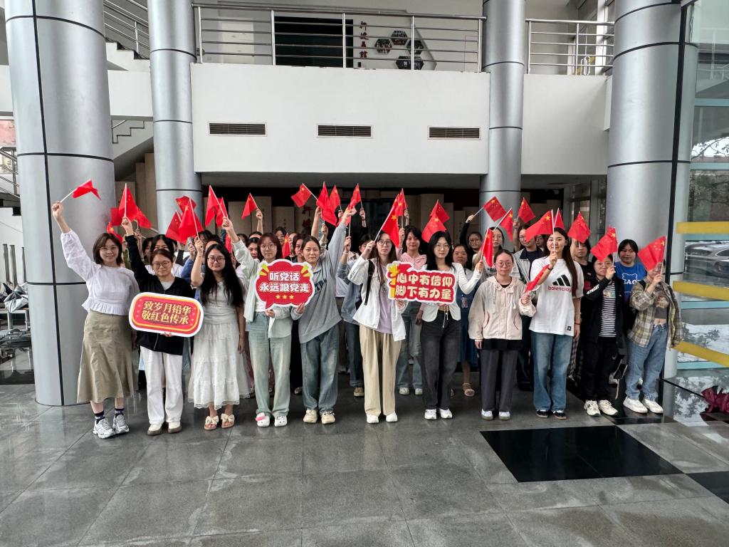 活动在一片温馨而又庄重的氛围中拉开序幕。随着悠扬的音乐响起,团支部成员们手持鲜艳的五星红旗,缓缓聚集在图书馆一楼。在团干部的精心组织下,大家以国旗为纽带,围成了一个巨大的爱心形状,每位同学的脸庞上都洋溢着对祖国的热爱与自豪,他们用行动诠释着对这片土地的深情告白:“祖国,我爱您!”这简单的几个字,却饱含了同学们对新中国75年来辉煌成就的无限敬仰和对未来美好生活的坚定信心。