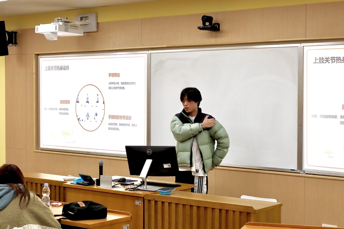 邬赟斐就热身活动展开了非常详细的讲解,并运用图片、视频和现场演示的方法让同学们更为直观的了解并学习正确的热身方式。在最后,他还推荐了三种使用率高、简单便捷的热身方法,进一步帮助同学们快速掌握正确的热身方式。
