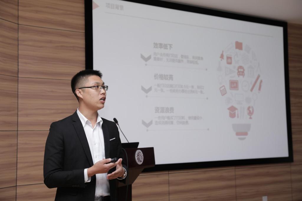 创业的开始,在一个很偶然的机会下。2017年12月份,承蒙经管系年级组组长于林老师的推荐,收到了泰隆银行第二天面试的通知,由于时间紧迫,还要做好相关面试准备,等想要去打印简历,都已经晚上10点多了,跑出去一看,附近的打印店都关门了,结果骑了一个单车跑到两公里以外的打印店。所以那时候就在想,能否有一款共享打印产品呢?24小时无人值守,随时随地都可以打印。作为一名退伍军人,执行力很强,有了想法就去落实,就找了15届软件班的几个室友说了这个想法,大家很赞成,后来又接触到了在五角场创业者实训基地有想法的几个伙伴,大伙一拍即成,开始了我们的创业项目。