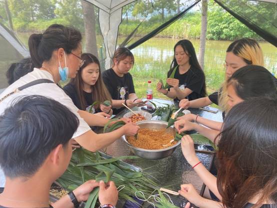 正值端午节即将来临之际,当天下午,为弘扬中华传统文化,进一步引导同学们了解和感受中华传统习俗,更好地继承中华优秀传统美德,还开展了“弘扬端午文化,传承浓情粽香”包粽子和彩绘草帽主题劳动活动。活动现场,基地的老师们向大家讲解了包粽子的步骤方法,折粽叶、装糯米、放馅料、压实、扎绳,同学们听完后跃跃欲试,不一会儿时间,桌上就放满了粽子。大家随后彩绘草帽,将草帽送给基地工作人员以表达对劳动者的感谢。