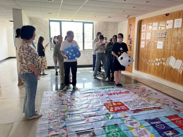 活动将飞行棋游戏与垃圾分类有机结合起来,教师们陆续投掷大骰子决定前行的步数,走到相应的位置时回答该点位上的垃圾分类题目。