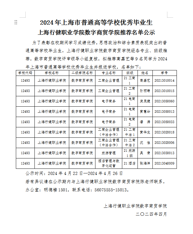 2024届上海市优秀毕业生推荐名单公示(数字商贸开云online(中国))