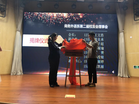 活动环节分为三大模块:“忆往昔,似水年华”、“惜当下,挥斥方遒”、“展未来,仰望天空”。商务外语系师生们欢聚一堂,同2018届毕业生们共同追忆美好时光,共祝美好未来。活动中,毕业生们表达了对学校及老师的感恩之情,商务外语系第二届校友会成立环节成为整场气氛的最高点,商务外语系主任张蕾老师与校友代表12级日语班王文浩同学共同为新一届校友会成立揭牌,完成了新一届校友会组建的工作。
