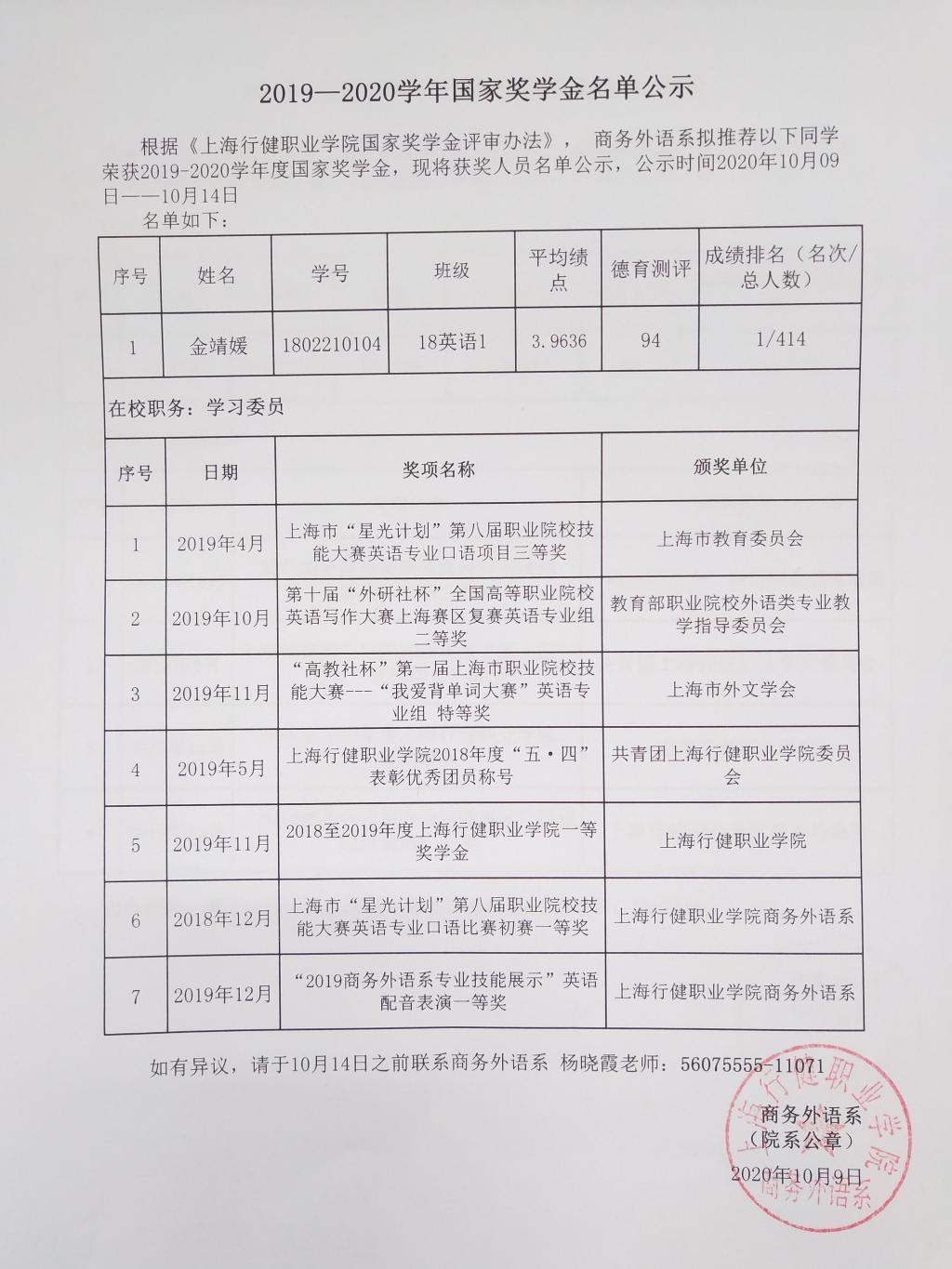 根据《开云网页版页面国家奖学金评审办法》,商务外语系拟推荐以下同学荣获2019-2020学年度国家奖学金,现将获奖人员名单公示,公示时间2020年10月09日——10月14日,名单如下图,如有异议,请于10月14日之前联系商务外语系 杨晓霞老师:56075555-11071