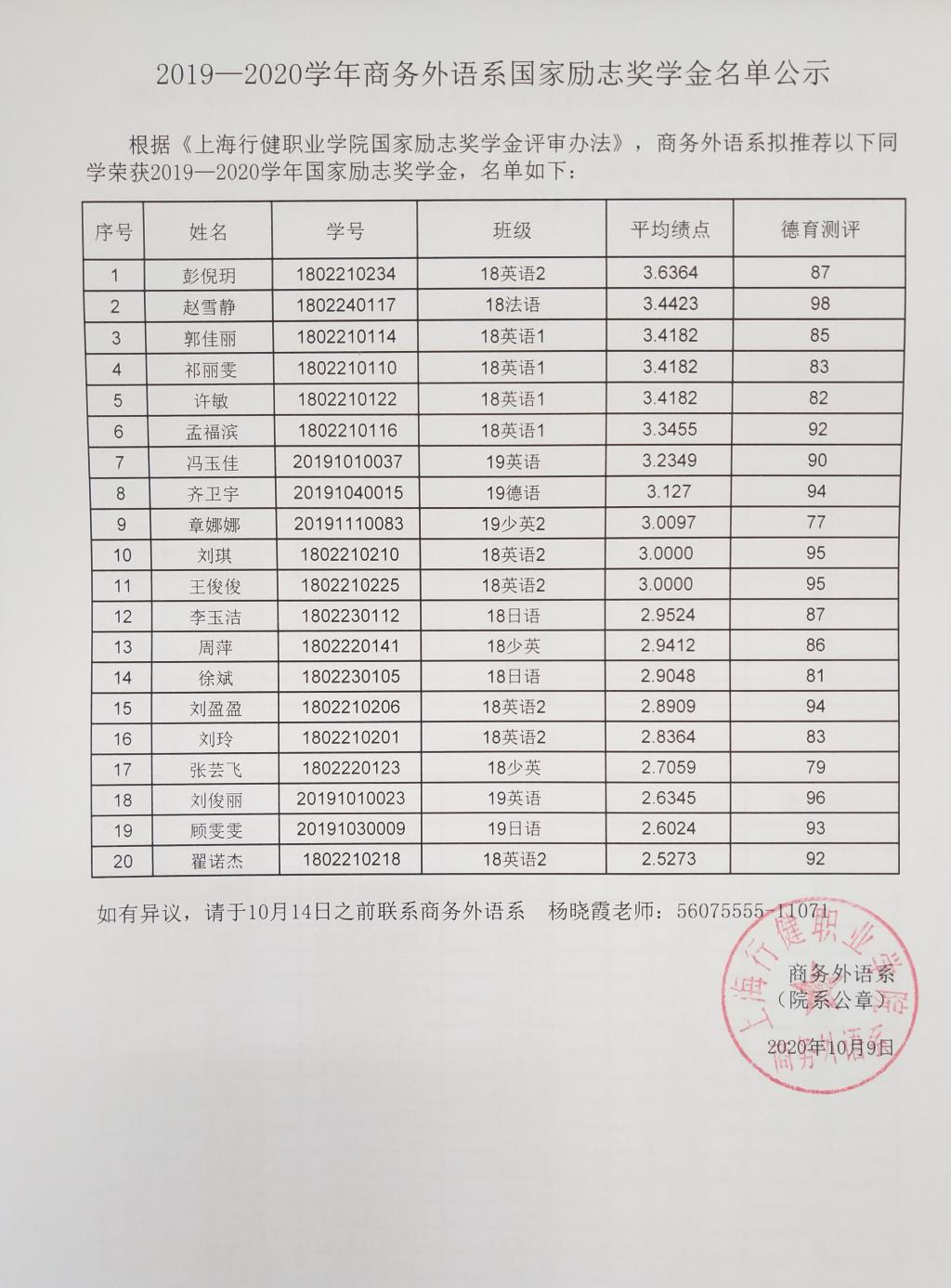 根据《开云网页版页面国家励志奖学金评审办法》,商务外语系拟推荐以下同学荣获2019—2020学年国家励志奖学金,名单如下图,如有异议,请于10月14日之前联系商务外语系 杨晓霞老师:56075555-11071