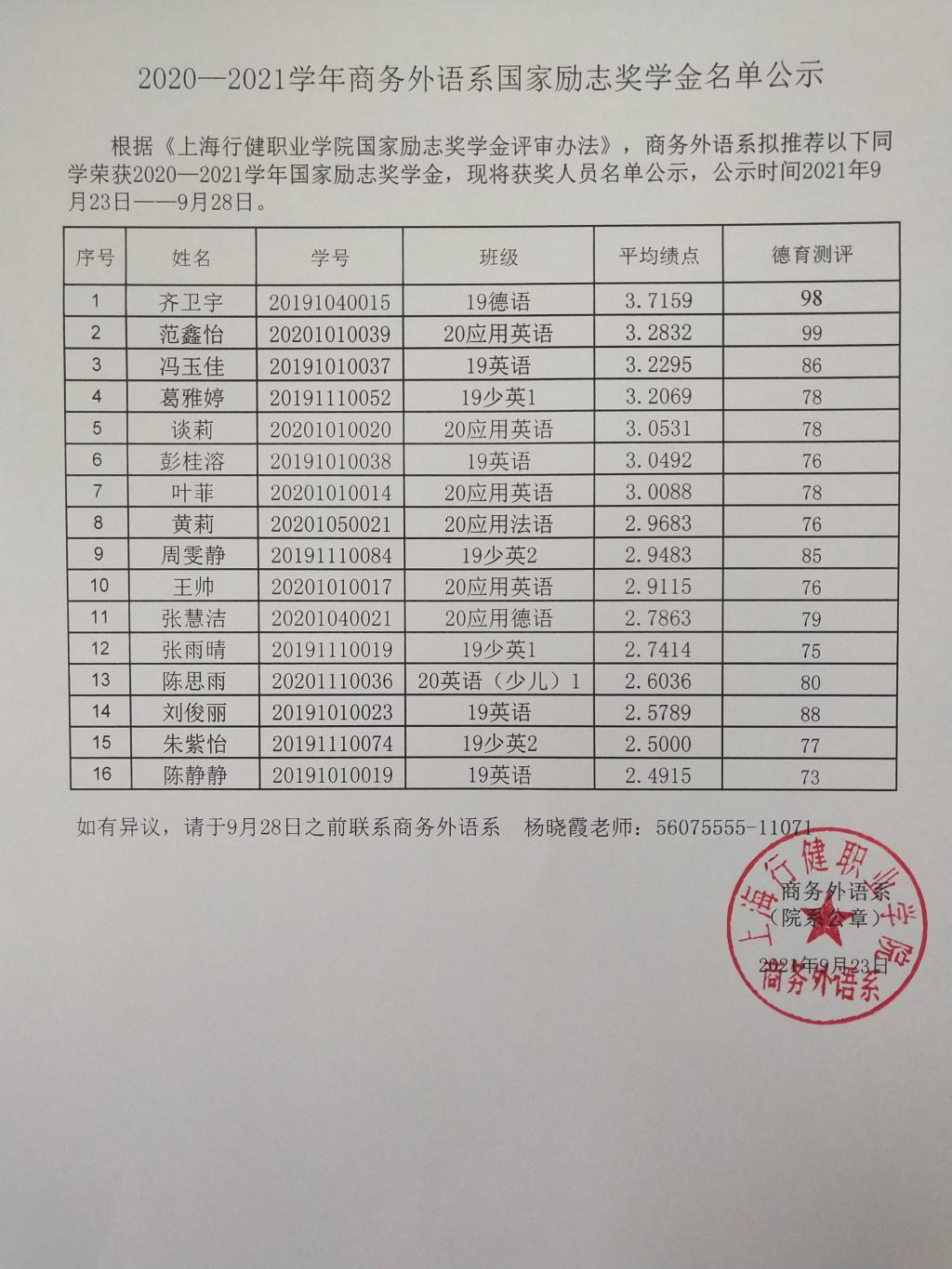 2020-2021学年商务外语系国家励志奖学金名单公示