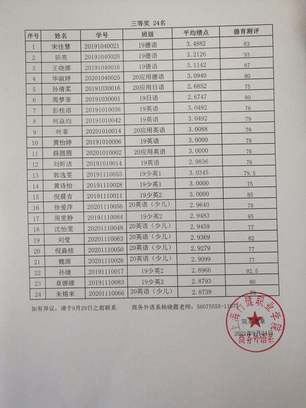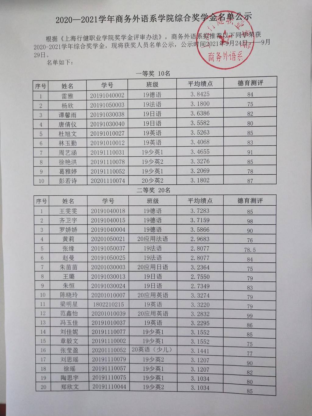 2020-2021学年商务外语系开云online(中国)综合奖学金名单公示